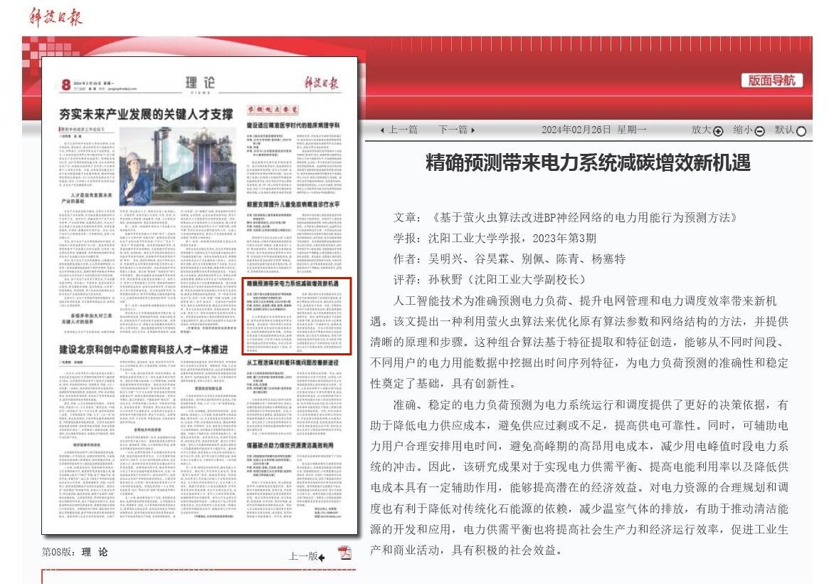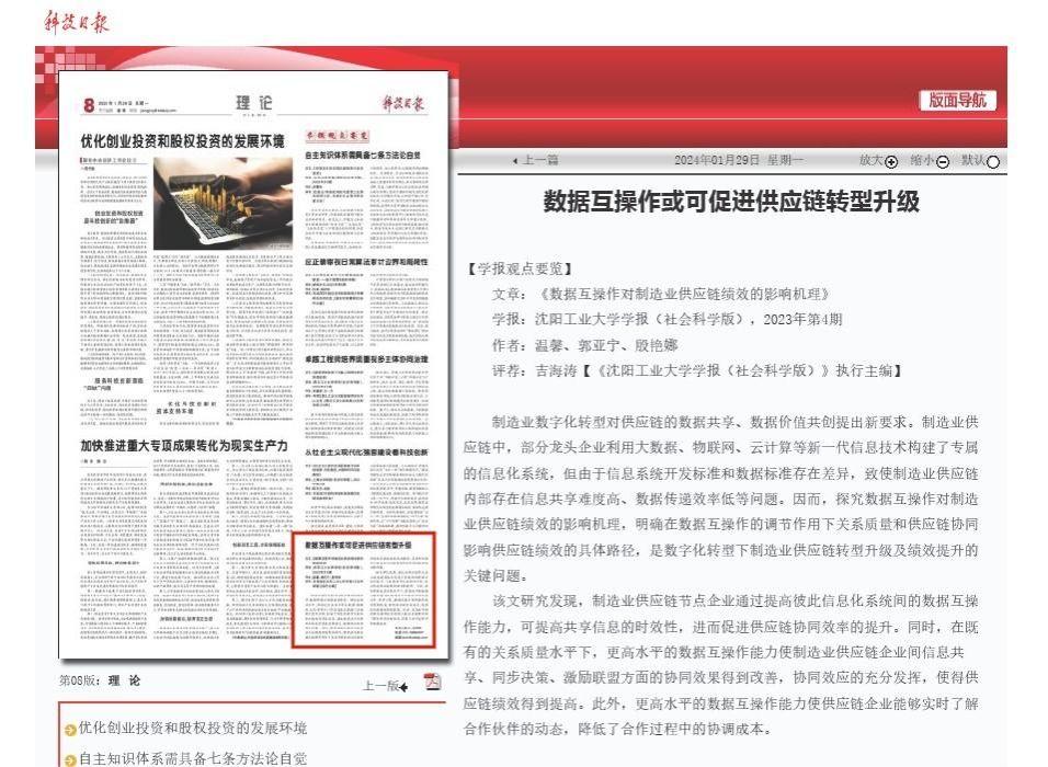 近期,《科技日报》理论版“学报观点要览”推介了两篇我校学报刊载的论文。其中,1月29日,该栏目推介了学报(社科版)2023年第4期刊载的论文《数据互操作对制造业供应链绩效的影响机理》;2月26日,该栏目推介了学报自然版2023年第3期刊载的论文《基于萤火虫算法改进BP神经网络的电力用能行为预测方法》,另有两篇学报稿件待刊发。