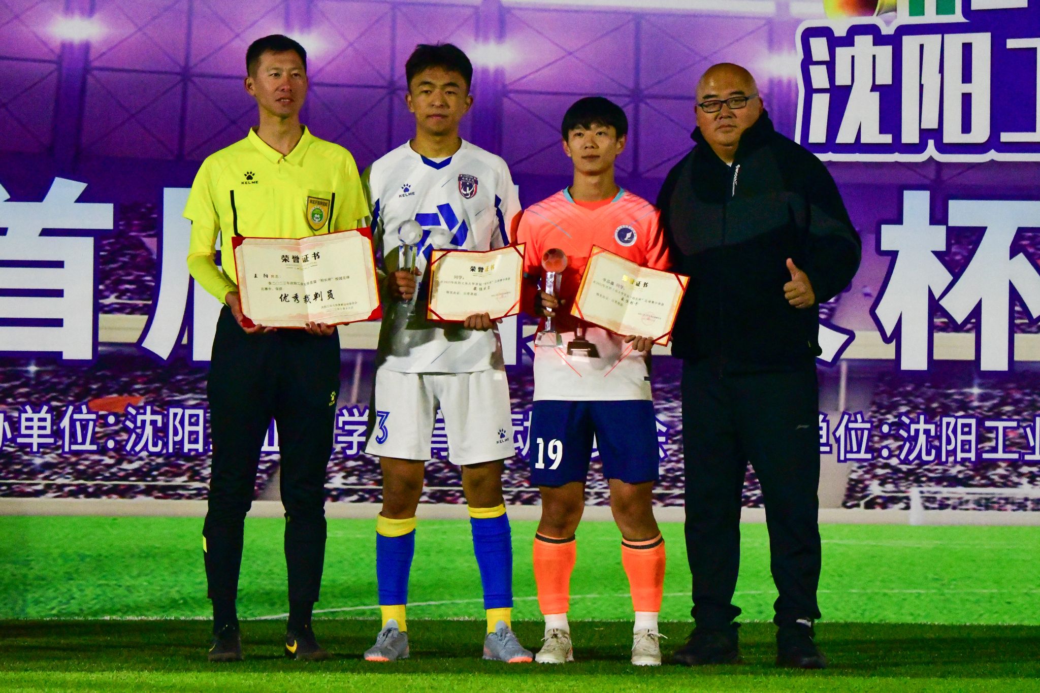 颁奖仪式上,党委常委、副校长孙秋野,体育部主任王宏俊,校团委书记陈文波分别为冠亚季军颁奖,本届比赛赞助商北方体育产业(辽宁)有限公司总经理、我校校友刘义军为最佳裁判员、最佳球员、最佳射手颁奖。