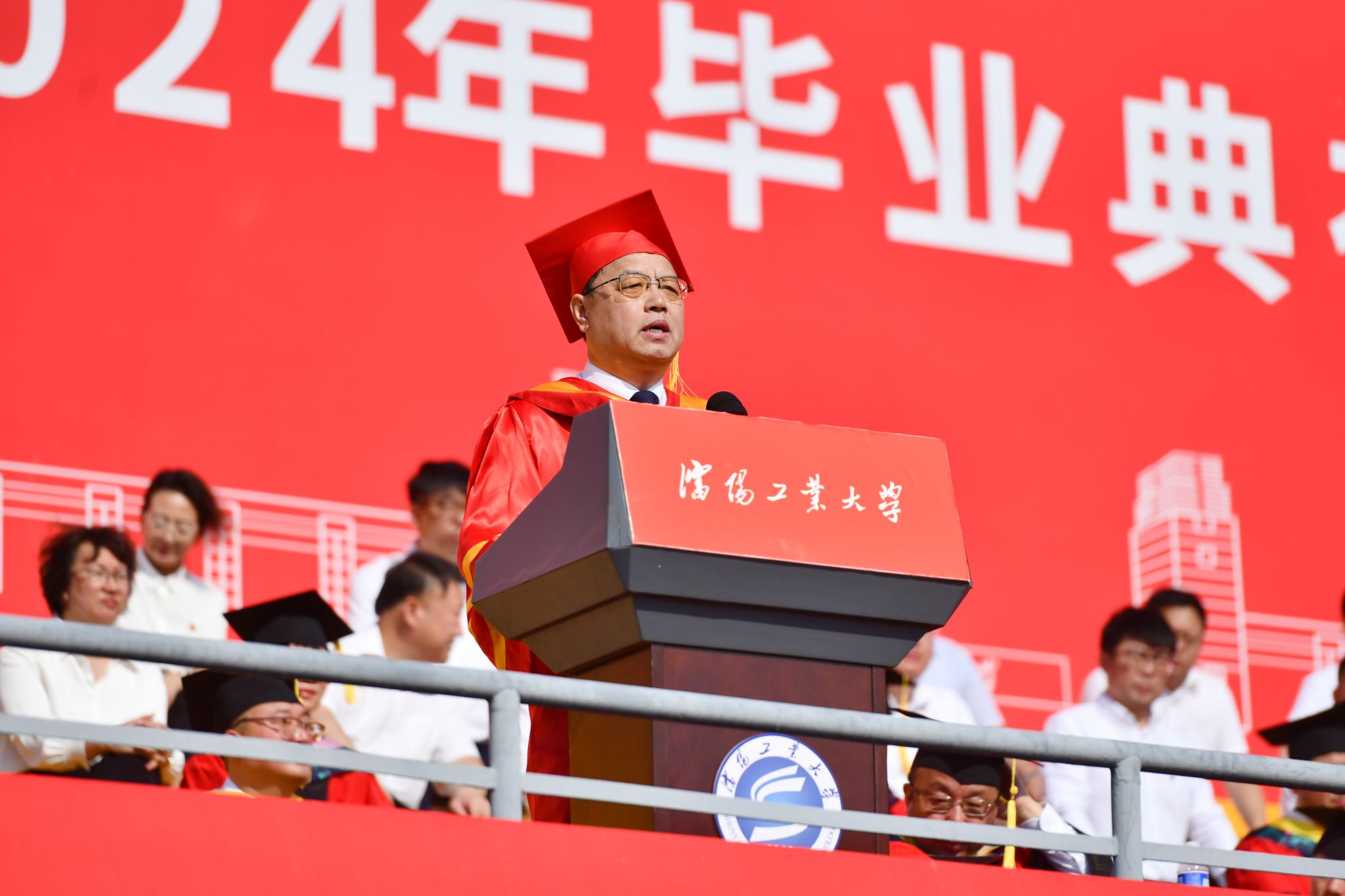 贾玉明为毕业生代表正冠拨穗、授予学位证书并深情寄语。他向圆满完成学业的2024届毕业生表示热烈祝贺,向潜心育人的老师们和默默付出的家长们致以崇高敬意。
